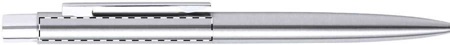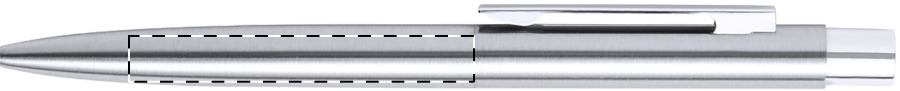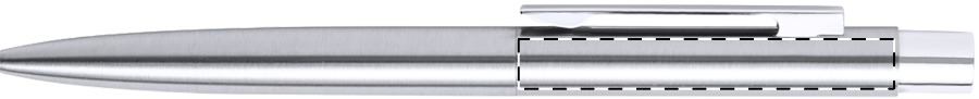 Penna a sfera in acciaio inossidabile riciclato con finitura argento e dettagli cromati, con refill blu e confezione in scatola di cartoncino kraft.