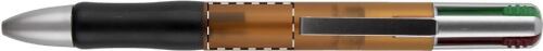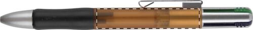 Penna a sfera in plastica colorata semi trasparente con impugnatura in gomma e clip cromata. 4 refill nei colori: blu, verde, rosso e nero.