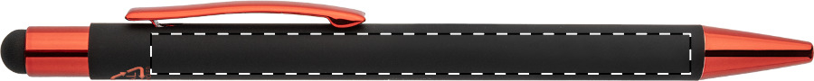Penna a sfera capacitiva in alluminio riciclato con corpo gommato nero e parti colorate con finitura metallica lucida. Lo speciale rivestimento permette l'incisione a specchio in colore coordinato delle parti metalliche. Refill blu.
