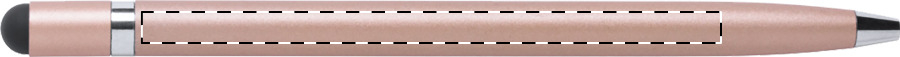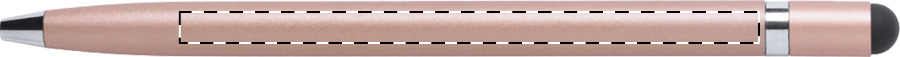 Penna a sfera in alluminio con meccanismo a rotazione, gommino capacitivo e refill blu.