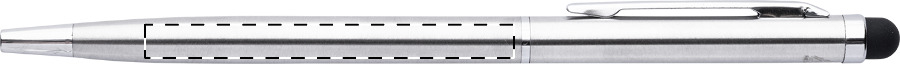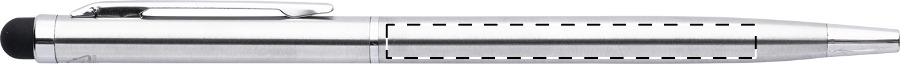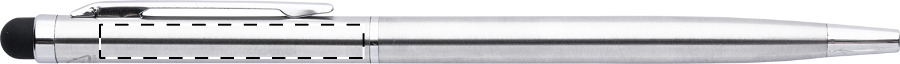 Penna a sfera capacitiva in acciaio riciclato con refill blu, meccanismo di apertura a rotazione e parti cromate.