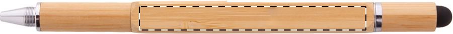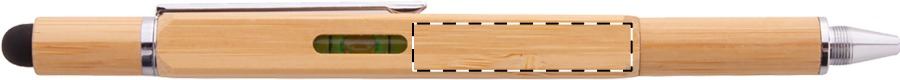 Penna a sfera capacitiva multifunzione in bambù con meccanismo a rotazione. Con doppia punta per cacciavite, livella e righello da 7 cm. Refill blu.