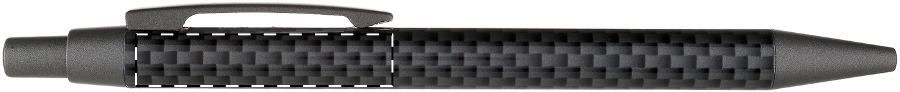 Penna a sfera in metallo e corpo con decorazione simil carbonio, in custodia di cartoncino nero. Con refill blu.