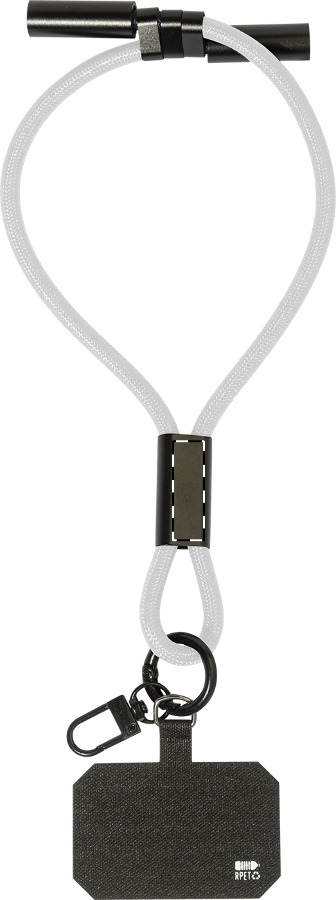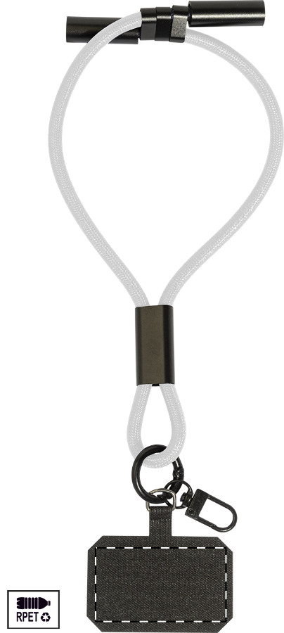Braccialetto porta cellulare in RPET con inserto per telefono, moschettone e cavo di ricarica USB-C a USB-C integrato e connettori nascosti. Supporta la ricarica rapida PD da 60 W e il trasferimento dati.
