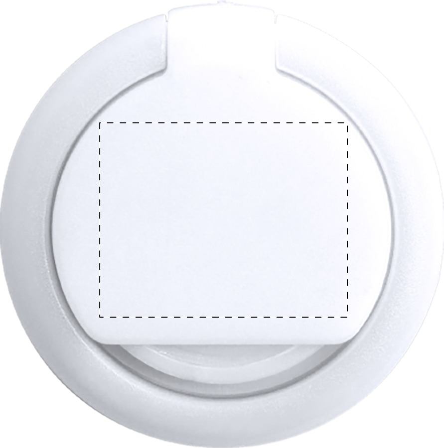 Supporto cellulare in plastica di forma rotonda con base autoadesiva e moneta per carrello della spesa.