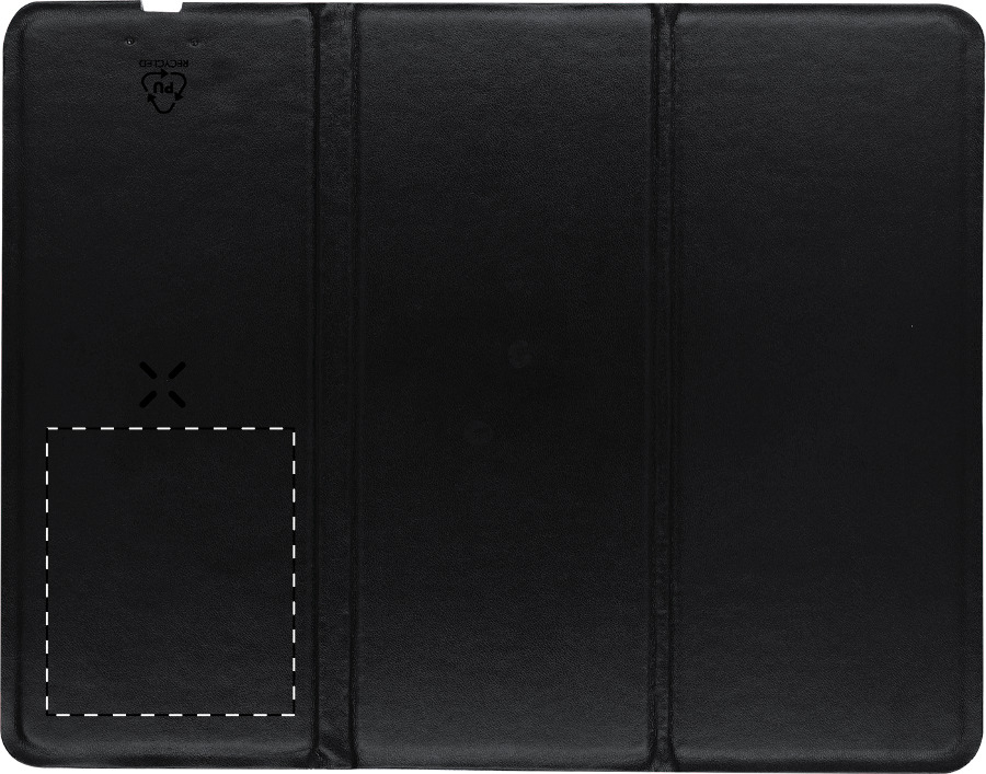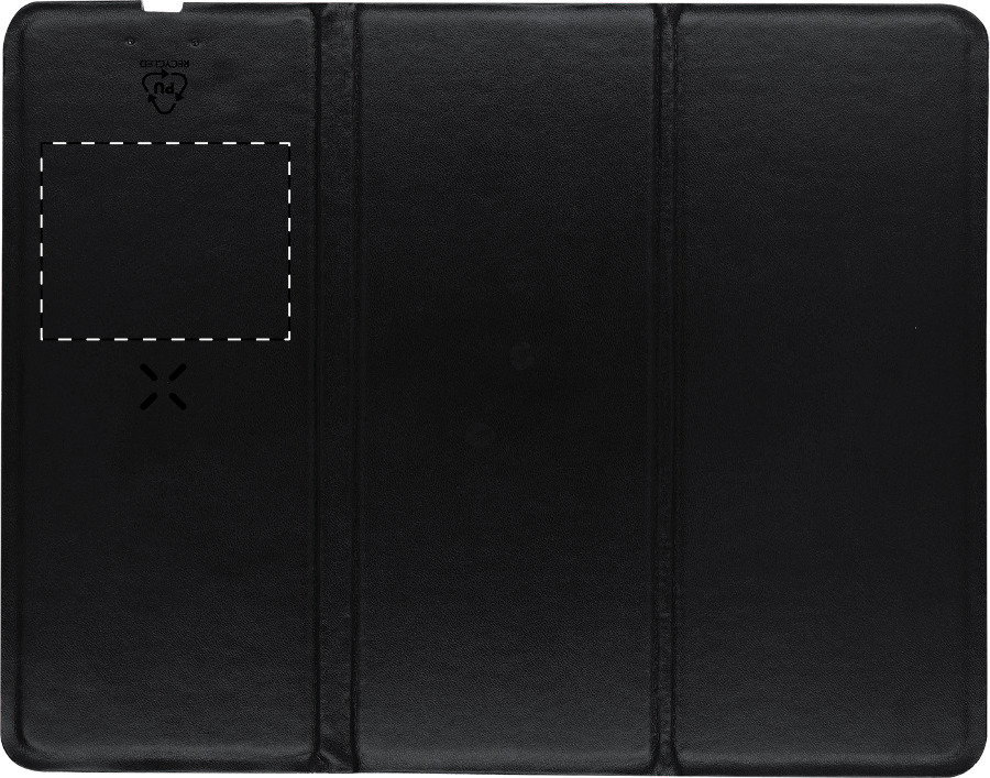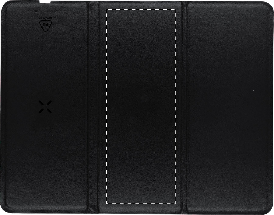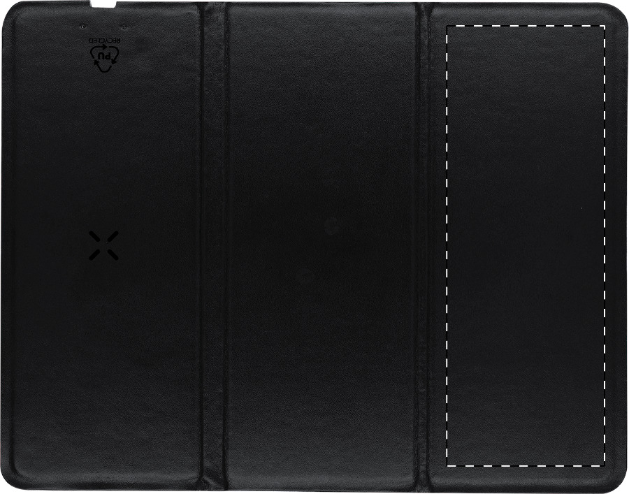 Tappetino per mouse ripiegabile in pelle PU riciclata con caricatore wireless integrato (10W) e funzione portacellulare. Con base antiscivolo in velluto e cavo di ricarica USB incluso.