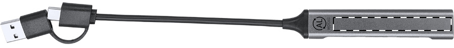 Hub USB in alluminio riciclato con 3 porte USB (USB 2.0) e 1 USB-C (USB 3.0). Cavo per connessioni USB e USB-C incluso.