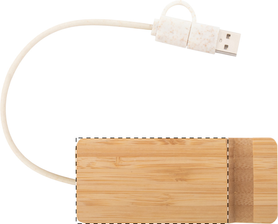 Hub USB in bambù con funzione di supporto per cellulare. Comprende 2 porte USB, una 1 USB-C ed USB 2.0. Incluso cavo con connessioni USB e USB-C.