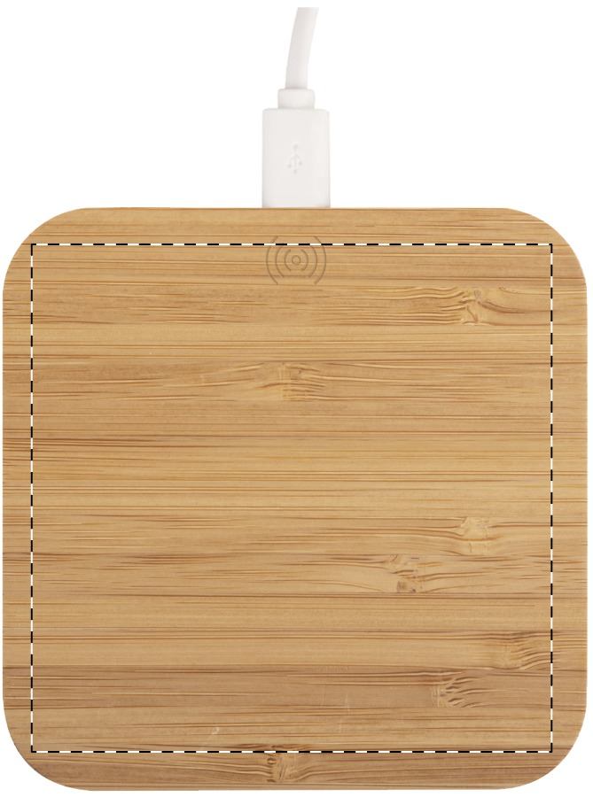 Caricabatterie wireless (10W) in bambù con 2 porte USB. Uscita massima 2100 mAh. Cavo di ricarica USB incluso.