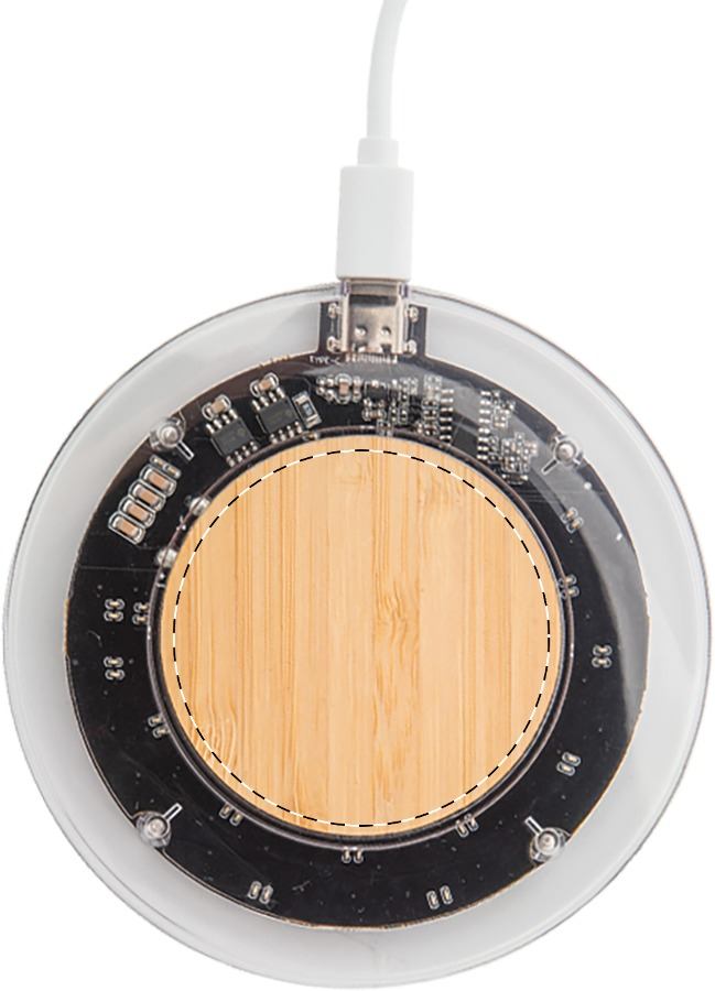 Caricabatterie rapido wireless da 15W, corpo in plastica trasparente e bambù con componenti elettronici a vista. Fornito con cavo di ricarica USB.