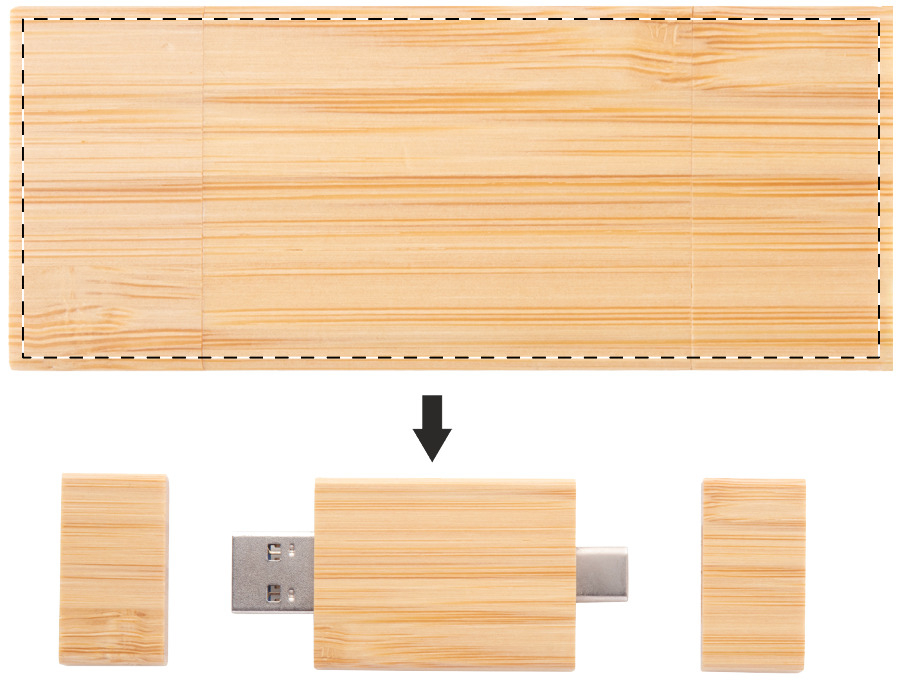 Chiavetta USB OTG in custodia di bambù con memoria da 8/16/32 GB. Con connessioni USB e USB-C. In busta di carta kraft. USB 2.0.