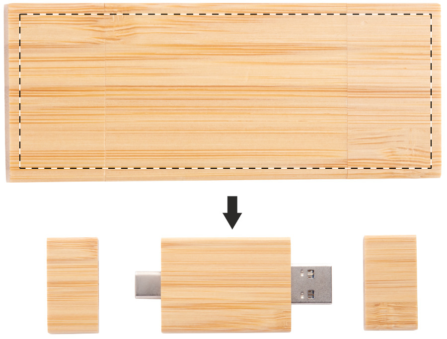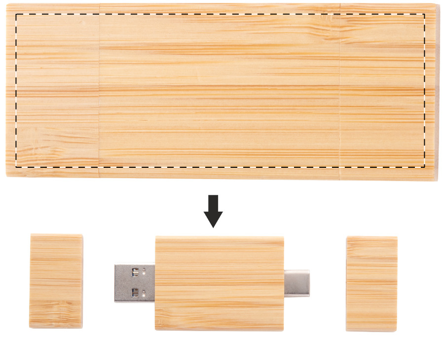 Chiavetta USB2.0 OTG con struttura in bambù e memoria da 4/8/16/32 GB. Connessioni USB e USB-C, confezionata in scatola di cartoncino kraft.