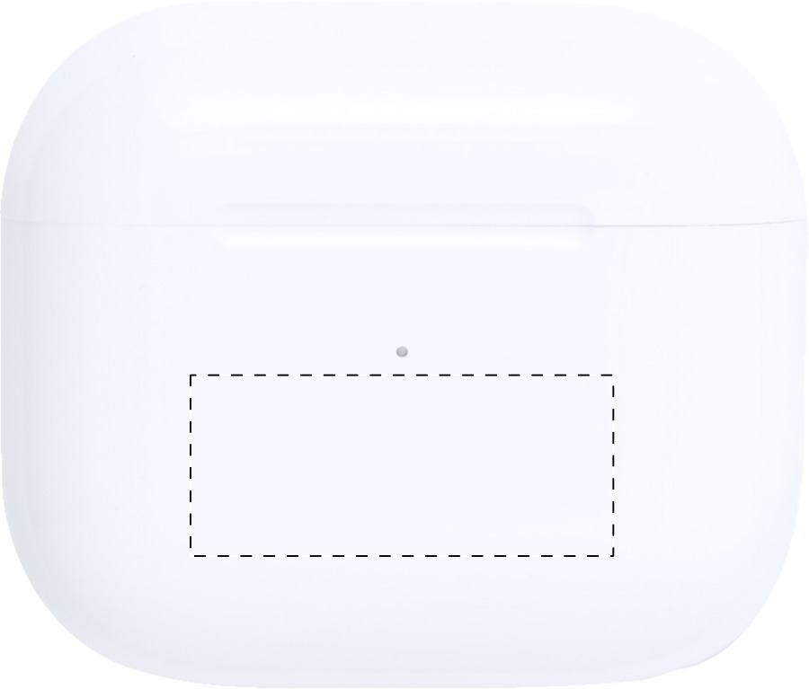 Auricolari stereo true wireless (TWS) con funzione di chiamata in vivavoce in una custodia di plastica per il caricabatterie. Incluso cavo di ricarica USB.