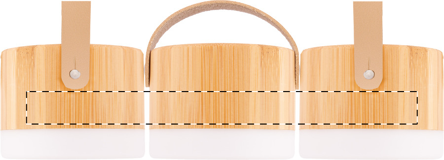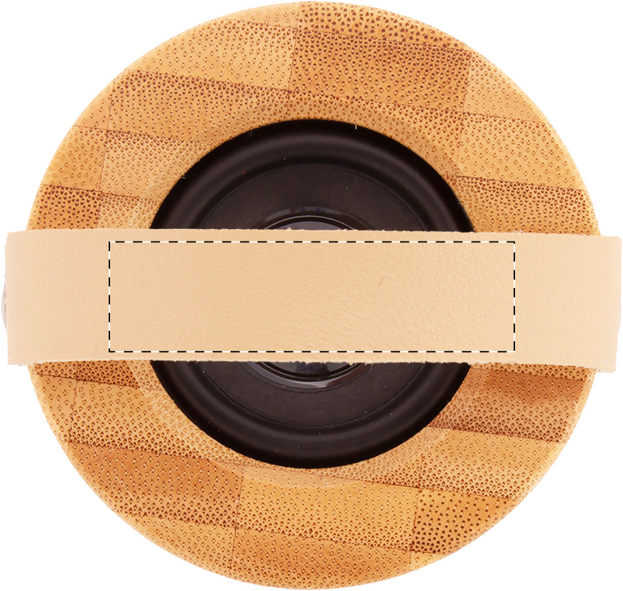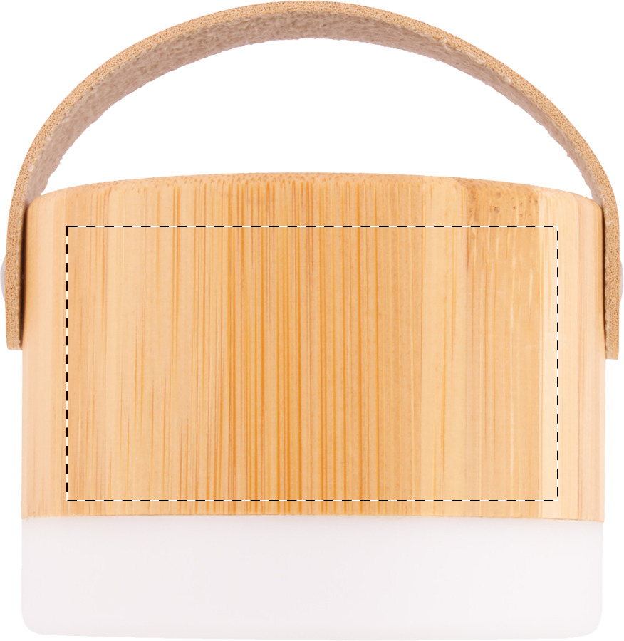 Altoparlante wireless in bambù e plastica ABS con luce LED nella parte inferiore, tracolla in pelle PU e batteria ricaricabile integrata. Incluso cavo di ricarica USB.