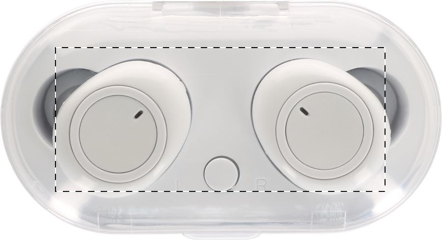 Auricolari stereo true wireless (TWS) con funzione di chiamata in vivavoce in una custodia di plastica per il caricabatterie. Incluso cavo di ricarica USB.