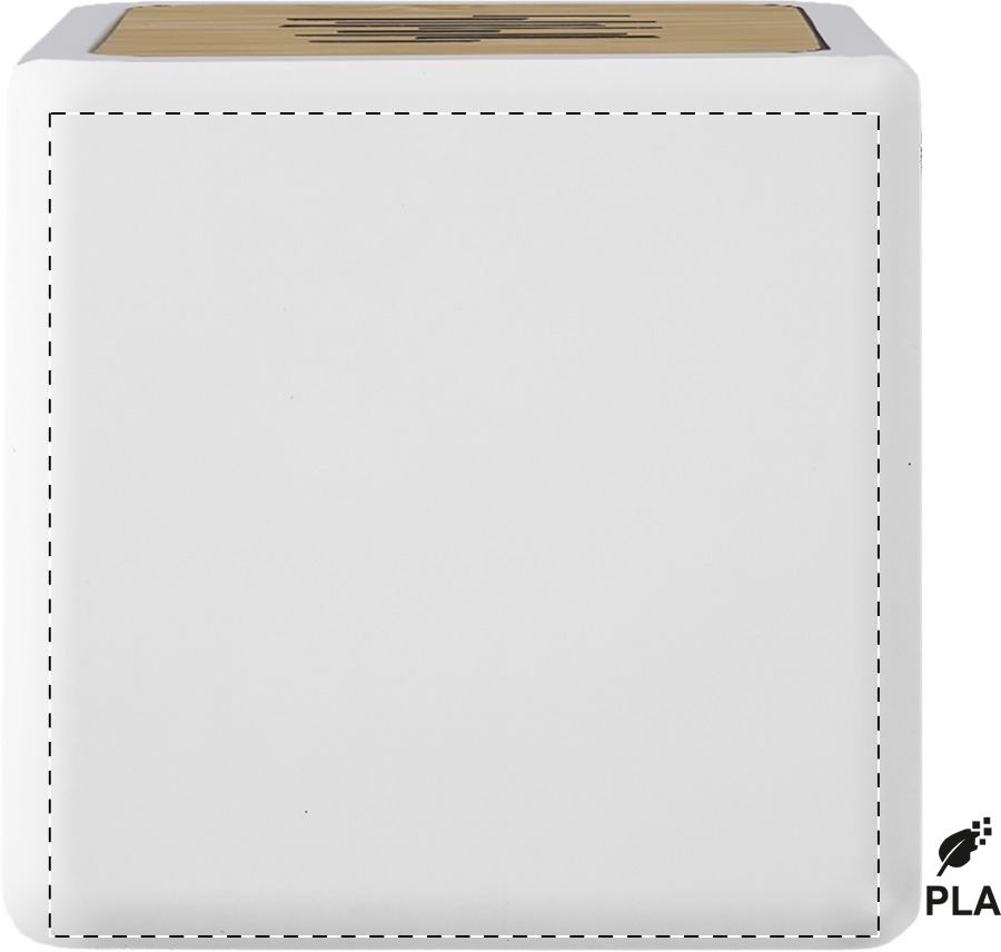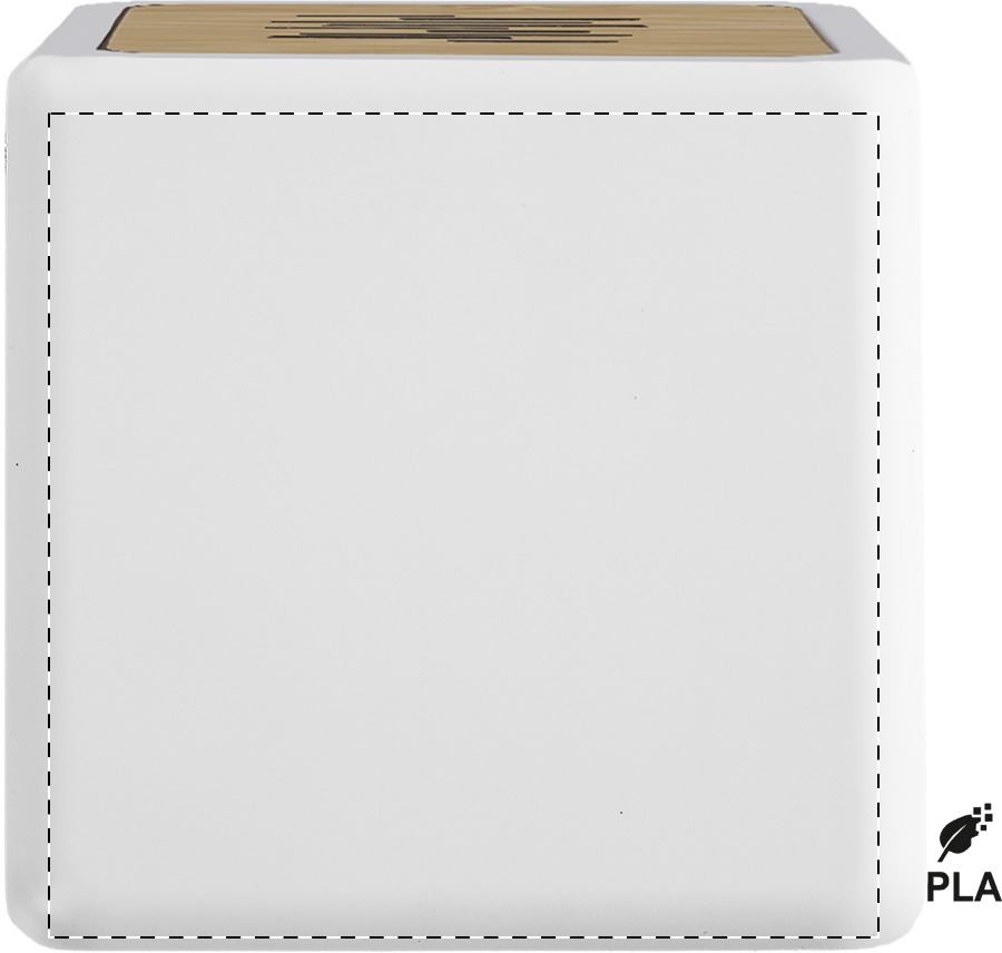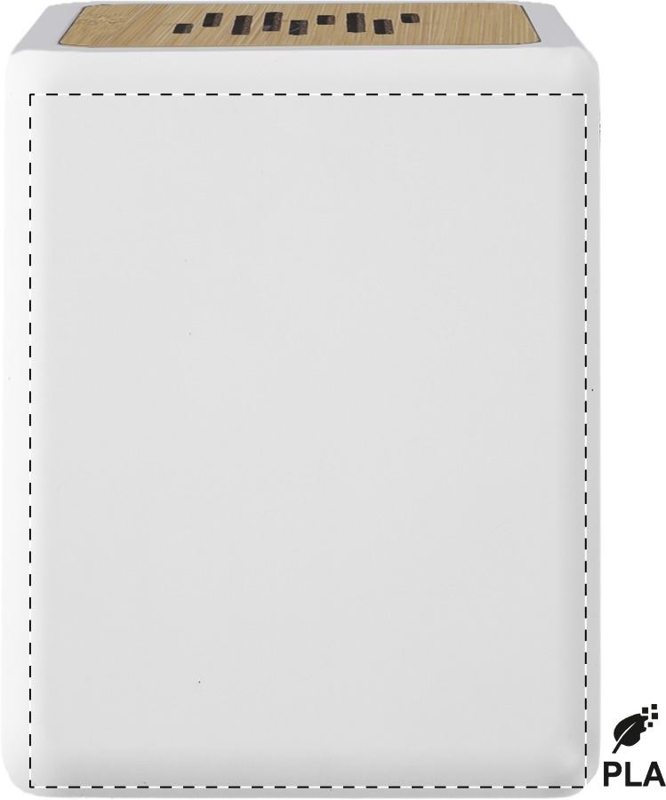 Altoparlante wireless con involucro in plastica PLA e bambù. Con funzione di chiamata in vivavoce e batteria ricaricabile integrata. Include un cavo di ricarica USB. Le parti in plastica sono in PLA 100% compostabile.