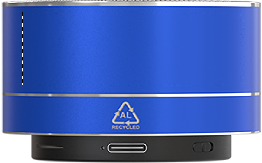 Cassa wireless in alluminio riciclato con rete metallica, luce LED sul fondo e batteria ricaricabile (300 mAh). Con funzioni di chiamata in vivavoce e riproduzione MP3 su micro SD. Cavo di ricarica USB incluso.