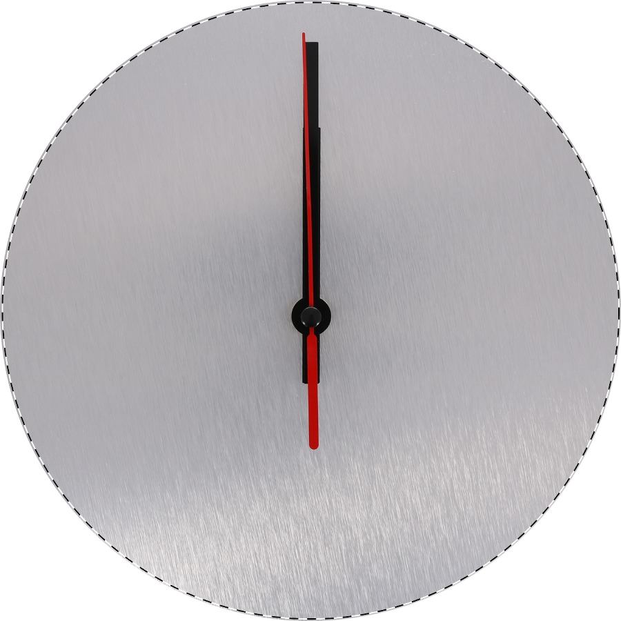 Orologio da parete di forma rotonda in composito di alluminio spazzolato con grafica personalizzata. Funziona con 1 batteria AA, non fornita. Il prezzo include la stampa a LED UV. MOQ: 25 pz.
