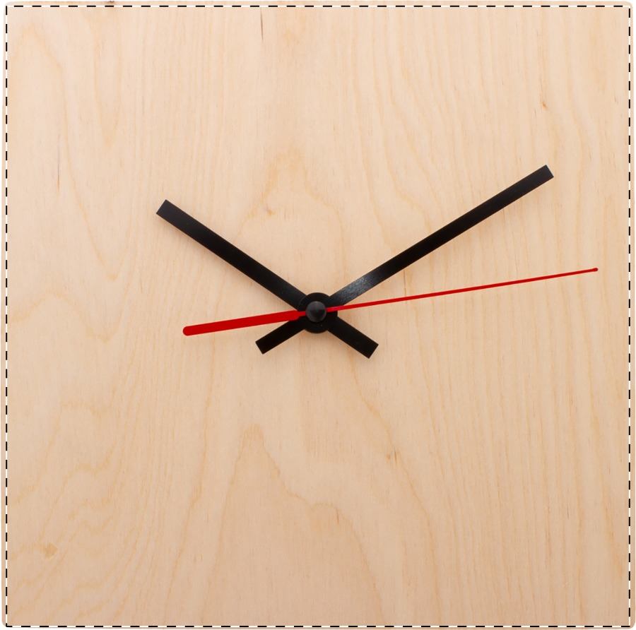 Orologio da parete in compensato di betulla di forma quadrata e grafica personalizzata. Funziona con 1 batteria AA, non fornita. MOQ: 50 pezzi.