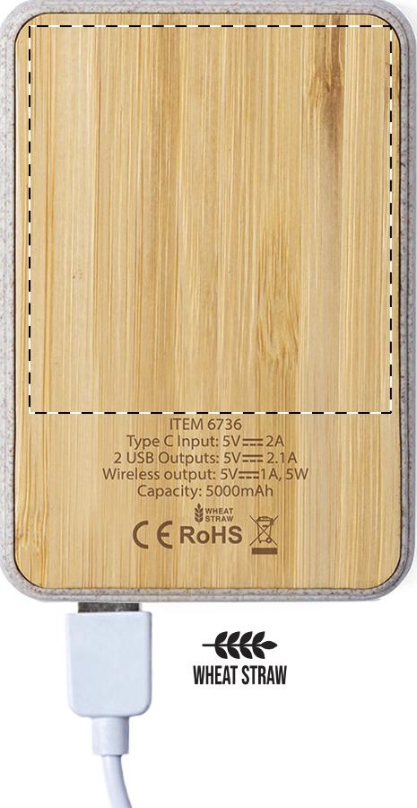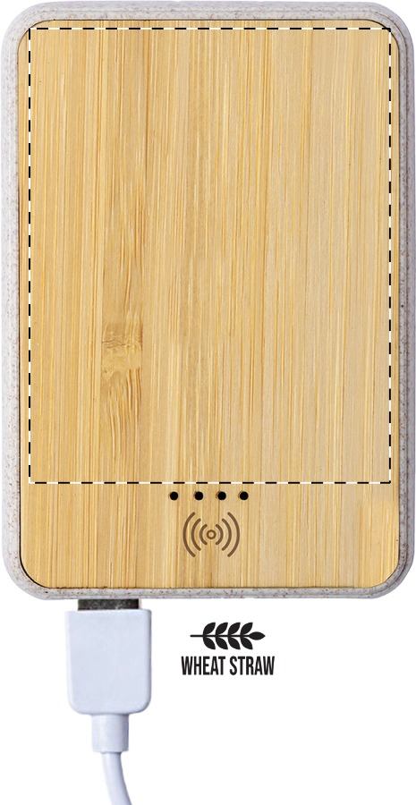 Power bank USB in bambù e paglia di grano con batteria da 5000 mAh e caricabatterie wireless integrato (5W). Con 2 porte di ricarica USB. Ricaricabile attraverso la porta USB-C. Cavo di ricarica USB incluso.
