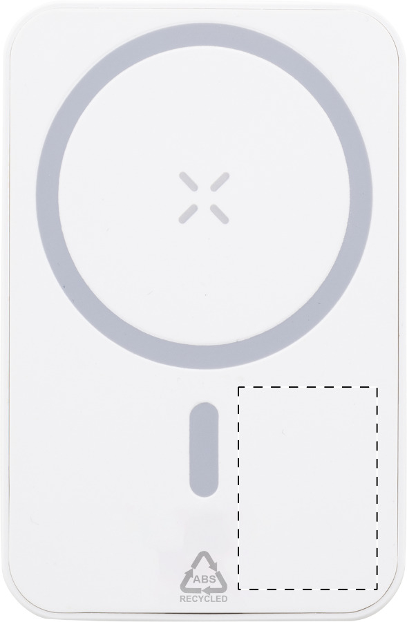 Power bank in ABS riciclato con batteria da 5000 mAh, caricatore wireless magnetico integrato (5W) ed ingresso e porta di ricarica USB-C. Viene compreso un anello metallico autoadesivo che consente di utilizzare la funzione magnetica su qualsiasi dispositivo ricaricabile in modalità wireless. Compatibile con iPhone® 12 o più recente. Cavo di ricarica USB incluso.