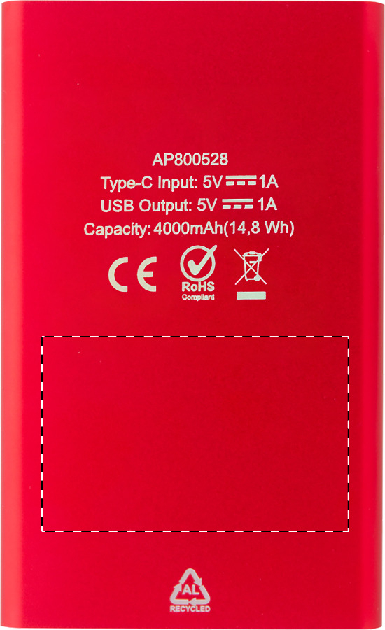 Power bank USB in alluminio riciclato con batteria da 4000 mAh. Con 1 porta di ricarica USB e 1 USB-C. Porta di ingresso USB-C. Cavo di ricarica USB incluso.