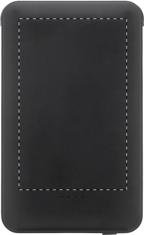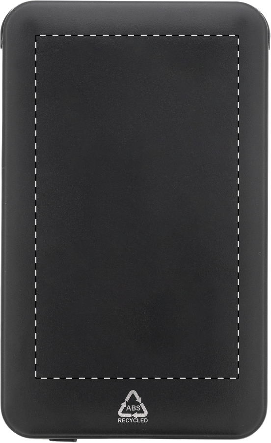 Power bank in ABS riciclato con batteria da 5000 mAh e cavi di ricarica integrati con connettori micro USB, USB-C e Lightning, porta di ricarica USB e porta di ingresso USB-C. Cavo di ricarica USB incluso.