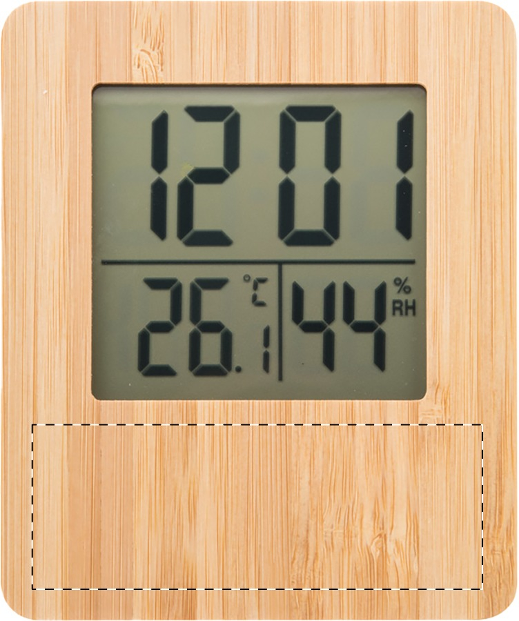 Stazione meteorologica e orologio digitale con pannello frontale in bambù. Funzioni: sveglia, calendario, termometro ed igrometro. Funziona con 2 batterie AAA, non fornite