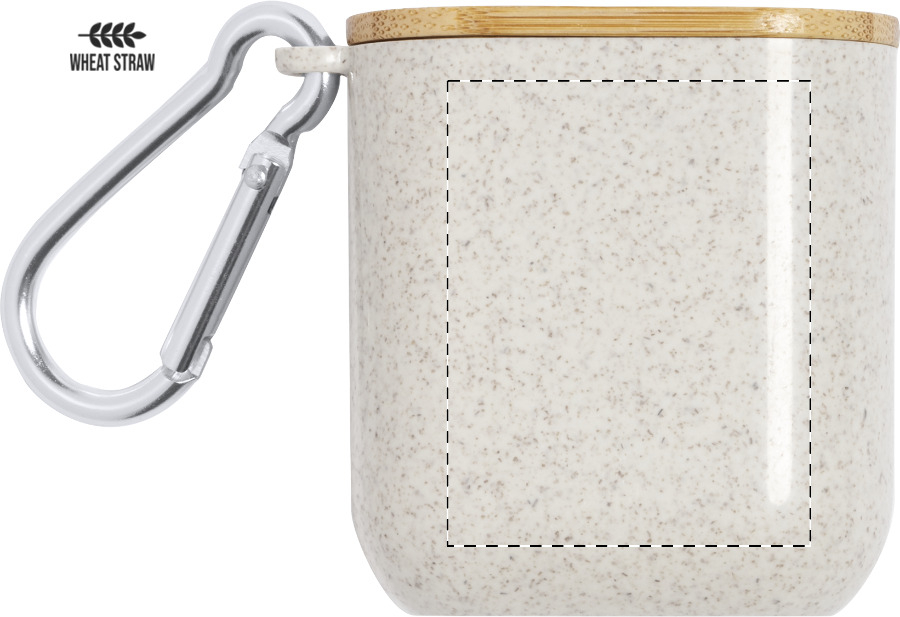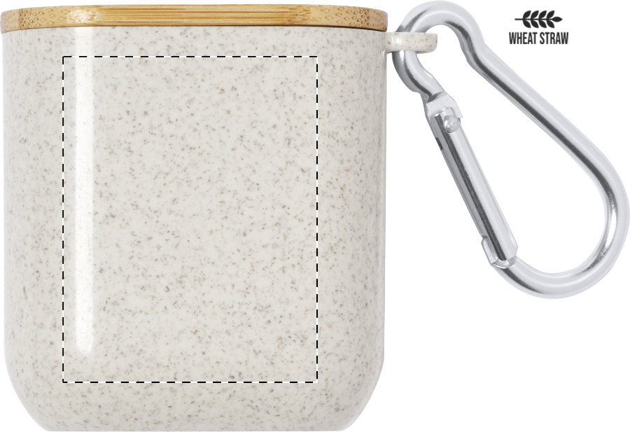Cavo di ricarica USB in astuccio di plastica ecologica in paglia di grano con moschettone e coperchio portacellulare in bambù. Con connettori micro USB, USB-C, Lightning ed ingressi USB e USB-C.