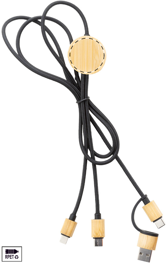 Cavo di ricarica USB in RPET e bambù con connettori micro USB, USB-C e Lightning ed ingressi USB e USB-C. Lunghezza del cavo: 100 cm.