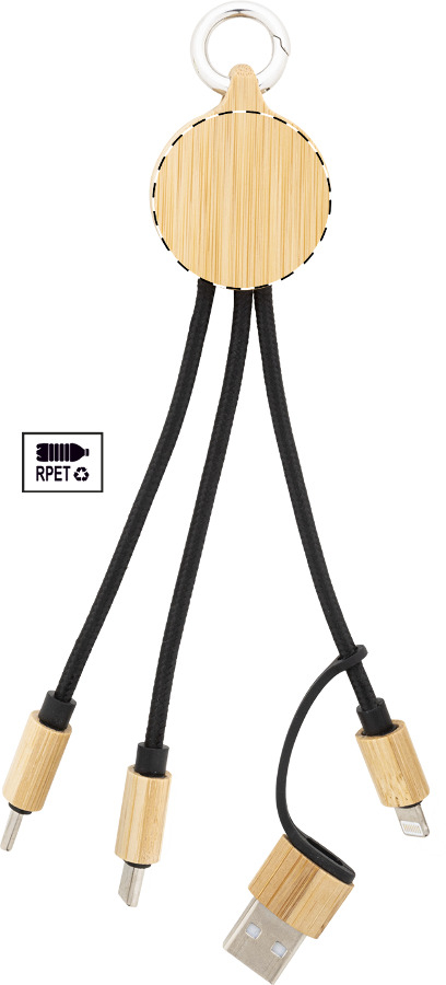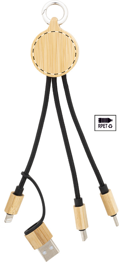 Gruppo cavi di ricarica USB in RPET e bambù con connettori micro USB, USB-C e Lightning, ingressi USB e USB-C e portachiavi.