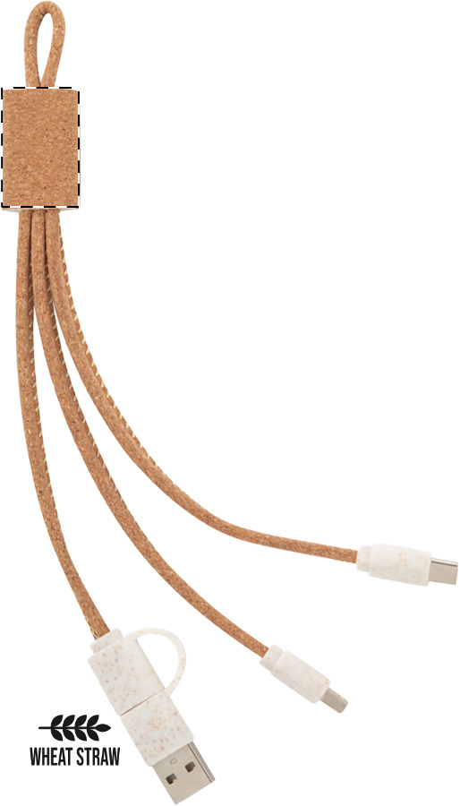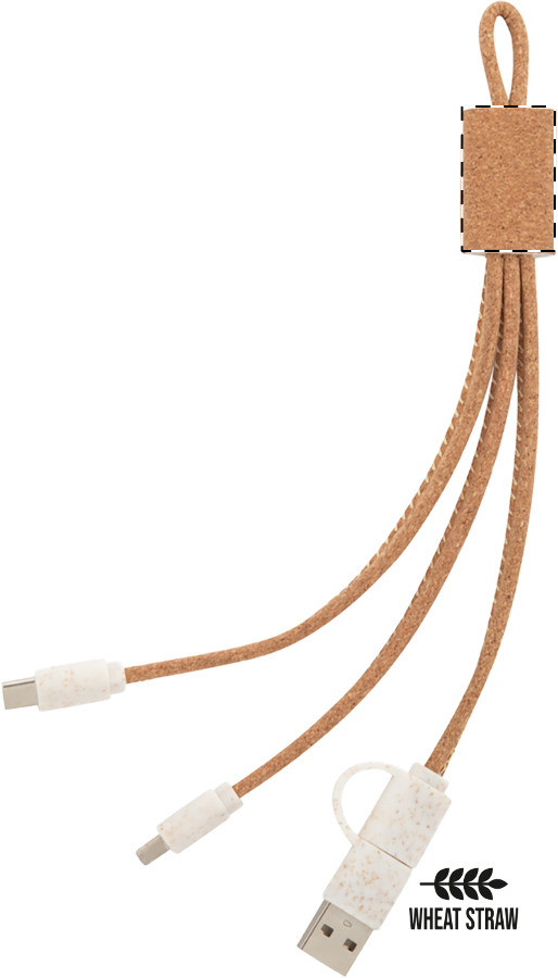 Cavo di ricarica in sughero naturale e plastica ecologica in paglia di grano con connettori micro USB, USB-C, Lightning, ed ingressi USB e USB-C.