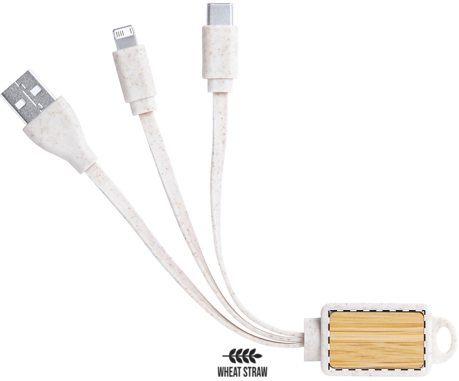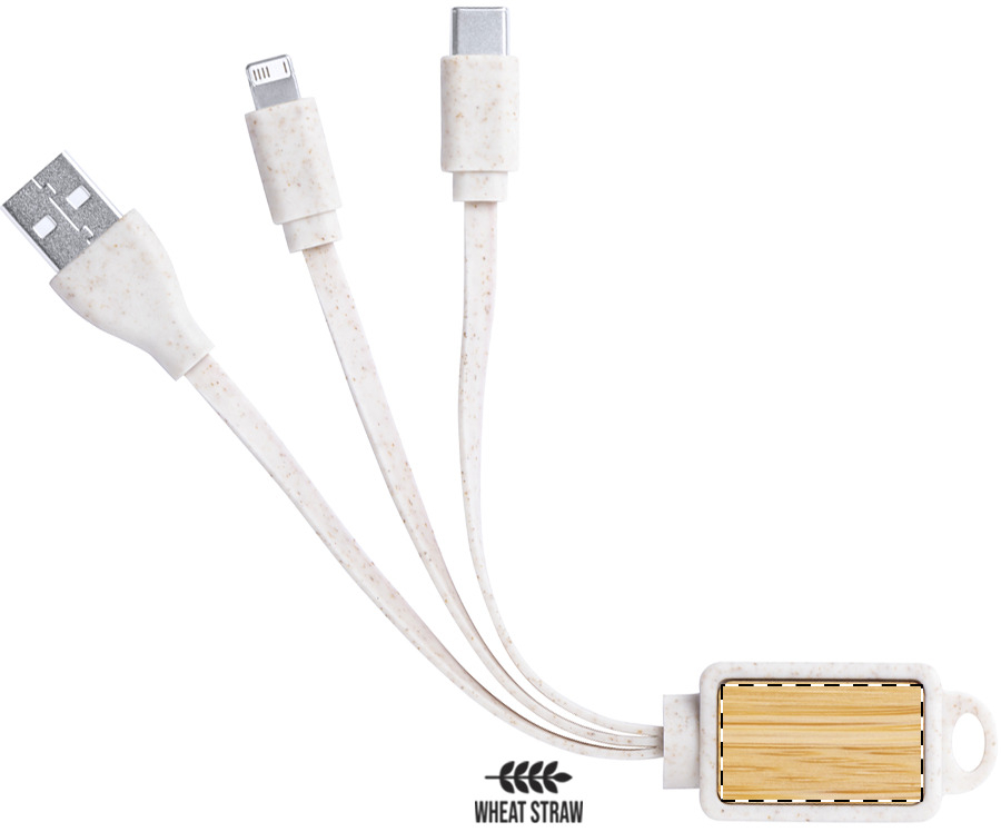 Portachiavi in bambù e plastica di paglia di grano ecologico con connettori micro USB, USB-C e Lightning.