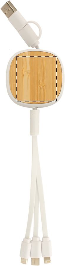 Cavo USB telescopico per caricabatterie in ABS riciclato e bambù. Con connettori micro USB, USB-C e Lightning ed ingressi USB e USB-C.