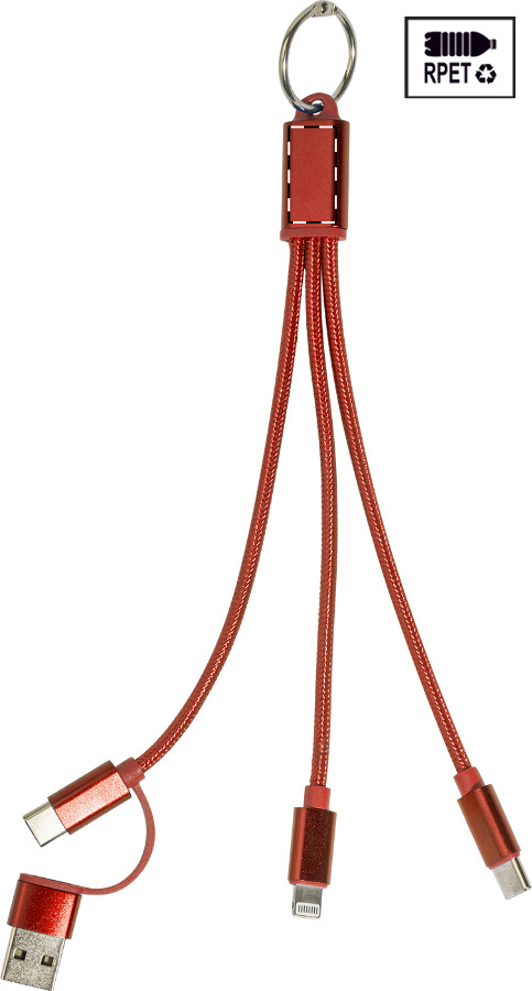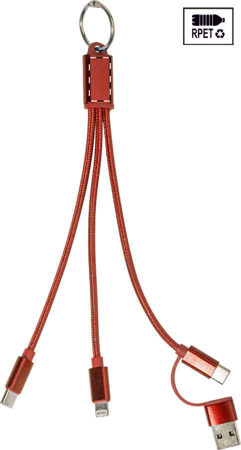 Cavo di ricarica USB in alluminio riciclato e RPET con portachiavi. Dispone di connettori micro USB, USB-C e Lightning. Con ingressi USB e USB-C.