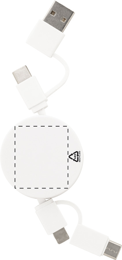Cavo di ricarica USB telescopico in ABS riciclato con connettori micro USB, USB-C, Lightning ed ingressi USB e USB-C.