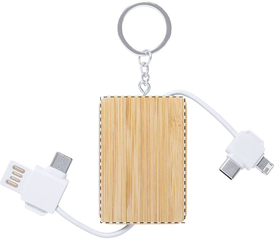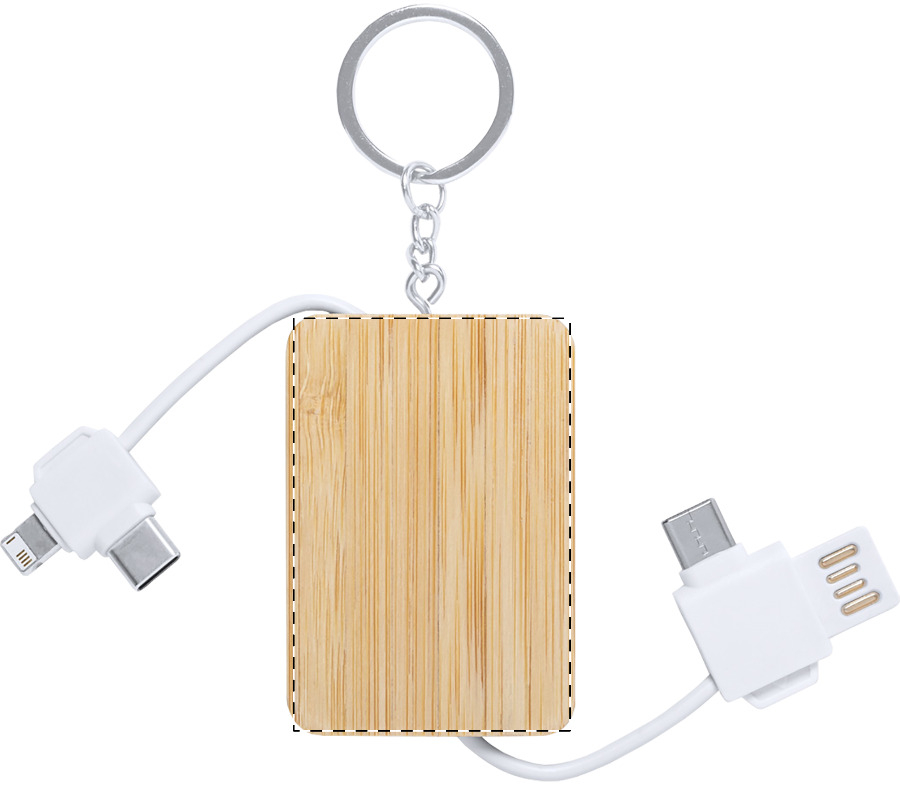 Portachiavi in bambù con cavo di ricarica USB, connettori micro USB, USB-C e Lightning. Con ingressi USB e USB-C.