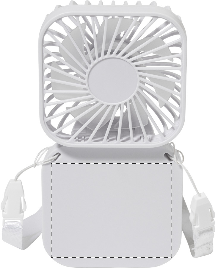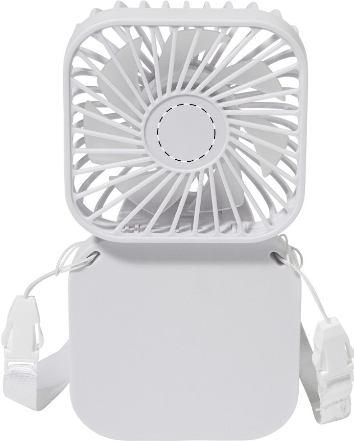 Ventilatore in ABS riciclato con cordino e batteria ricaricabile USB integrata (500 mAh). Angolo della testa regolabile e 3 impostazioni di velocità. Cavo di ricarica USB incluso.