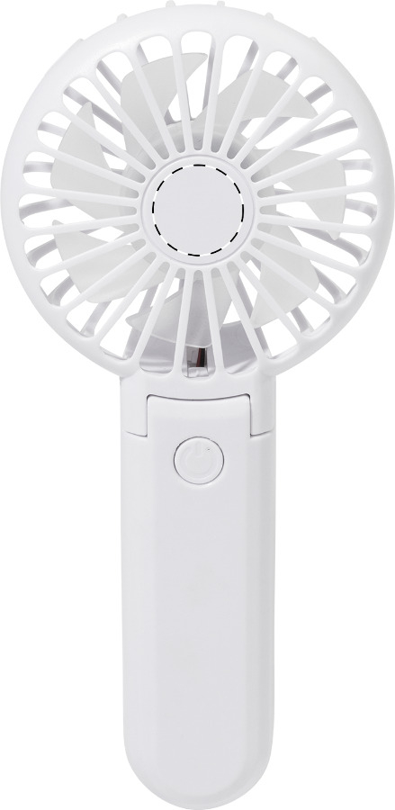 Ventilatore in ABS riciclato con batteria ricaricabile USB integrata (400 mAh). Angolo della testa regolabile e 3 impostazioni di velocità. Cavo di ricarica USB incluso.