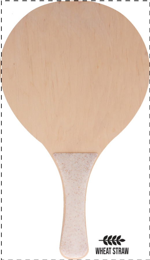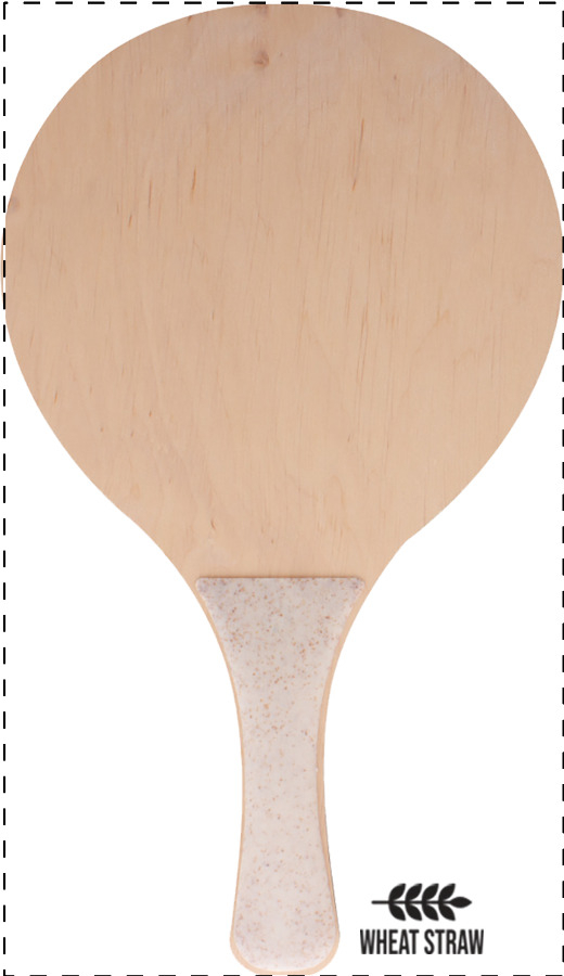 Set pallina e 2 racchettoni da spiaggia in compensato di betulla e plastica ecologica di paglia di grano. Il costo comprende una medesima stampa a colori sul lato anteriore di entrambe le racchette. MOQ: 50 pezzi.