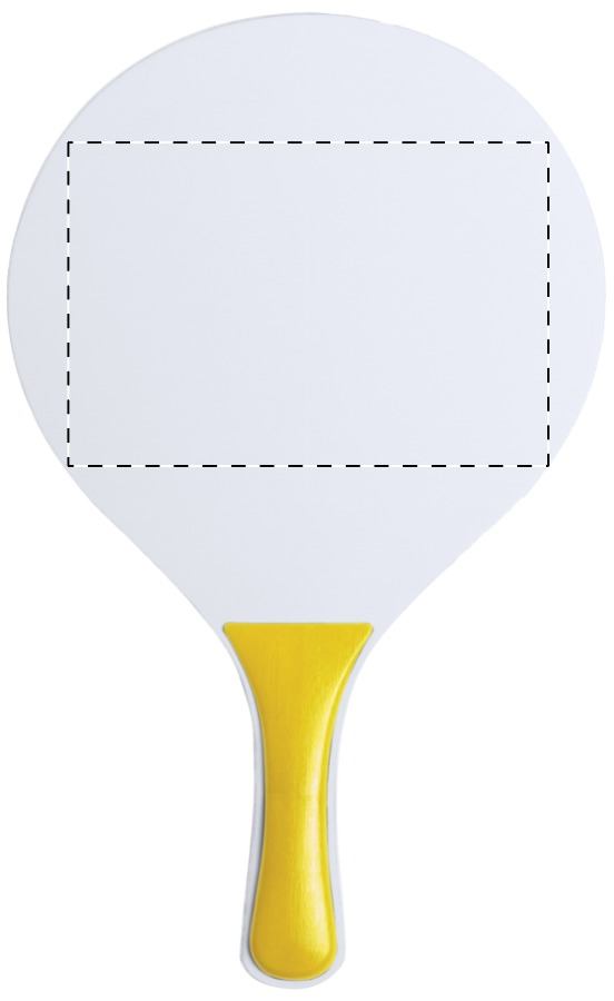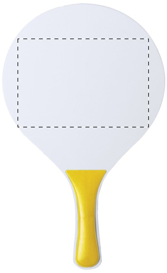 Beach tennis con 2 grandi racchette e una pallina, in legno e plastica.