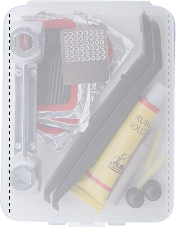 Kit per la riparazione di biciclette in una custodia di plastica PP trasparente. Include una chiave esagonale e un kit per la riparazione delle forature (2 leve per pneumatici, grattugia, colla, 2 tappi per valvole, 2 tubicini per valvole e 5 toppe per pneumatici).