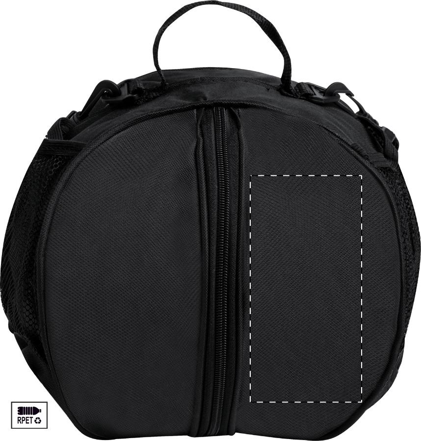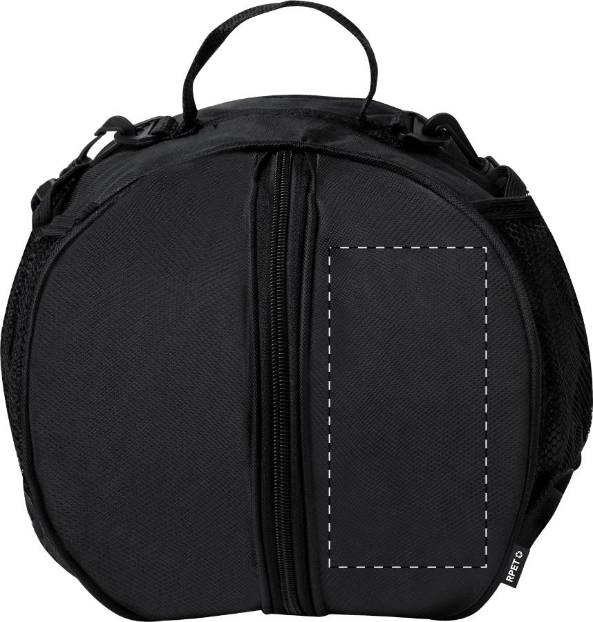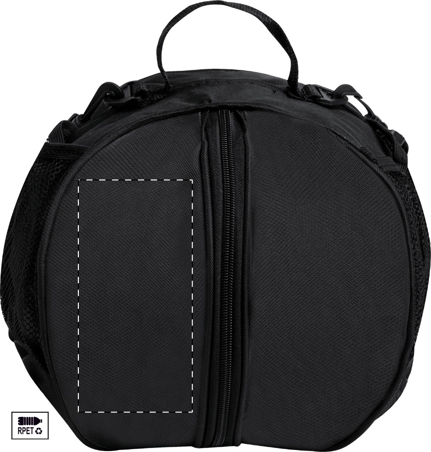 Borsa porta pallone in poliestere 600D RPET con cerniera, tasca in rete portabottiglie e tracolla regolabile. Consegnata senza pallone.