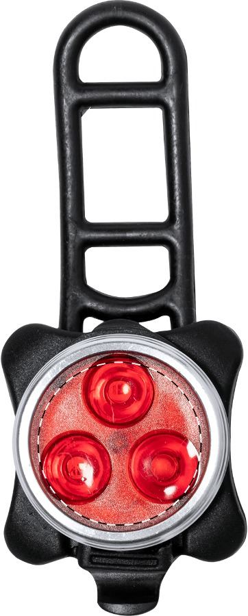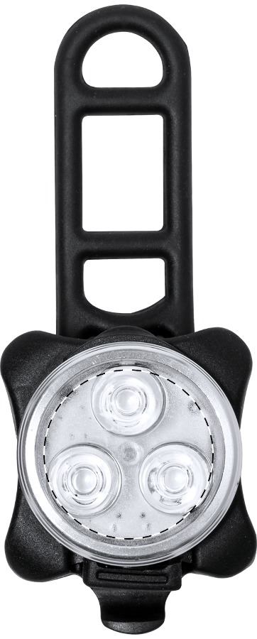 Set di luci per bicicletta in plastica con luce anteriore a 3 LED e lampeggiatore posteriore a 3 LED, batteria ricaricabile USB integrata (650 mAh) e cinghie elastiche. Modalità di funzionamento a luce fissa e lampeggiante. Cavo di ricarica USB incluso.