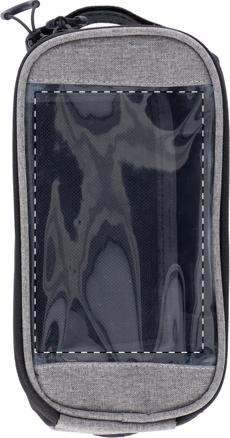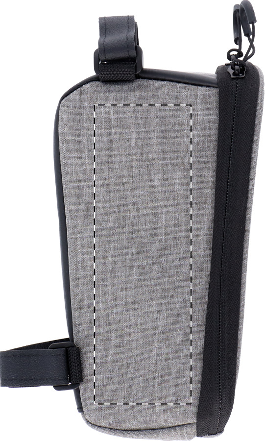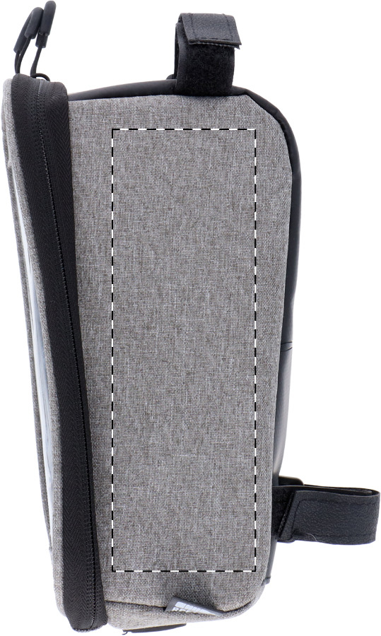 Borsello imbottito in poliestere 600D RPET con cerniera per il telaio della bicicletta, cinghie in velcro regolabili, scomparto portacellulare con schermo capacitivo e etichetta RPET.