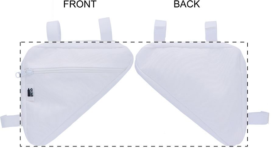 Borsa in poliestere 600D RPET per telaio di bicicletta con cerniera e cinghie regolabili in velcro. Personalizzabile con grafica stampata in sublimazione su tutta la superficie ed etichetta RPET. MOQ: 25 pezzi.