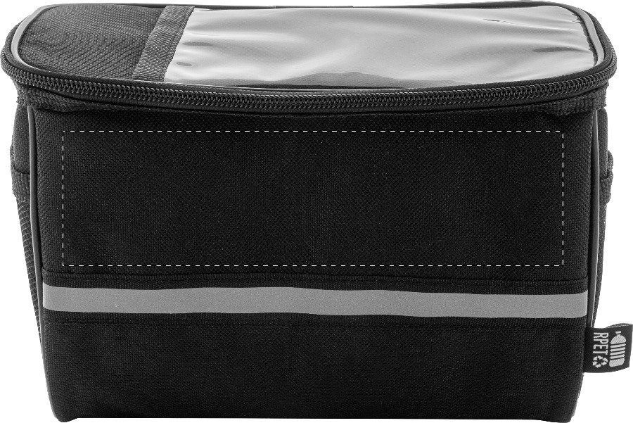 Borsa in poliestere 600D RPET per manubrio di bicicletta con scomparto chiuso da cerniera, tasca portacellulare touchscreen, tasche laterali in rete, cinghie regolabili in velcro, striscia riflettente ed etichetta RPET.
