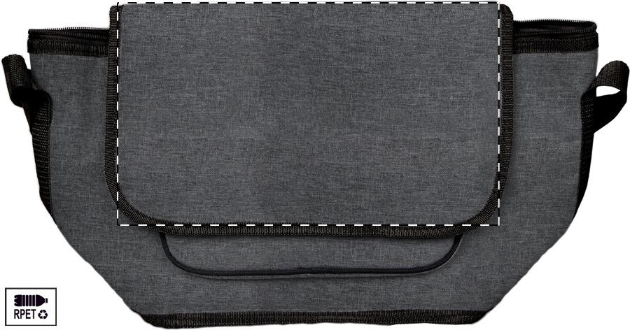Borsa termica in poliestere 600D RPET con imbottitura in PEVA, scompartimenti con cerniera, manici con velcro e tracolla regolabile. Etichetta RPET.