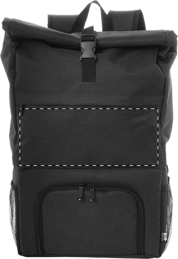 Zaino Rolltop in poliestere 600D RPET termico con scomparto imbottito in PEVA chiuso da cerniera per il contenitore del pranzo. Scomparto principale con chiusura a fibbia, tasca frontale con cerniera, tasche laterali in rete, spallacci imbottiti ed etichetta RPET.