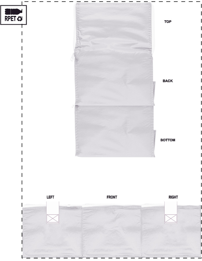Borsa termica in poliestere 600D RPET personalizzabile con zip ed imbottitura in alluminio per 6 lattine da 0,33 L. Con grafica stampata in sublimazione su tutta la superficie ed etichetta RPET. MOQ: 25 pezzi.